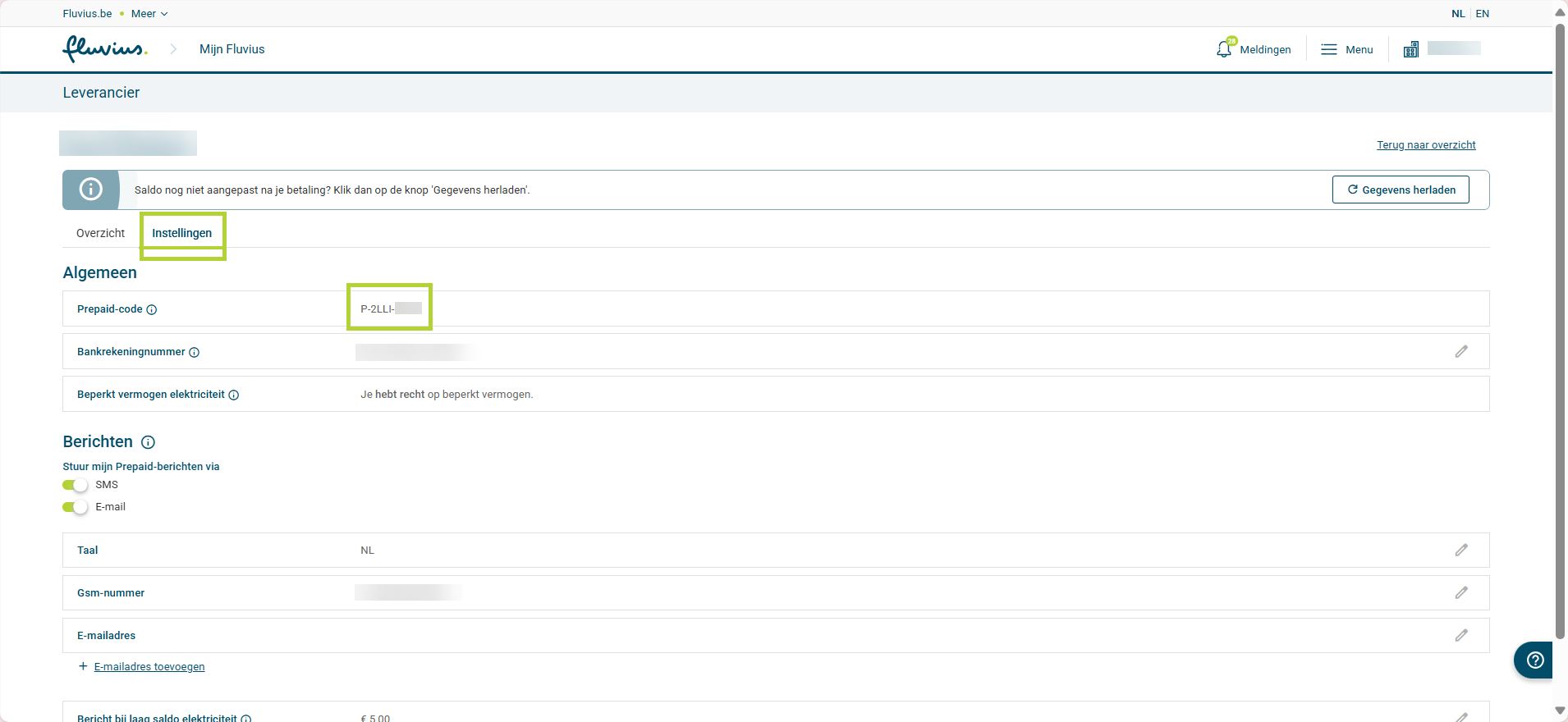 Tip: Nadat we Prepaid hebben geactiveerd, kreeg je een persoonlijke Prepaid-code. De code begint met de letter P, gevolgd door 8 cijfers en letters. Prepaid-code-code vergeten? Ga naar mijn.fluvius.be/leverancier en kijk bij je instellingen om je Prepaid-code te vinden.