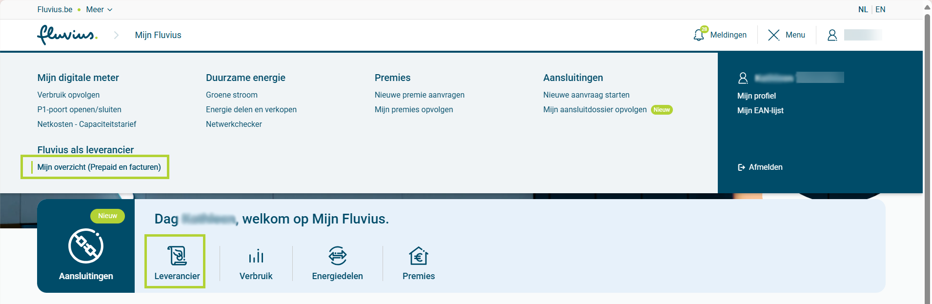 Ga naar het menu en klik onder ’ Fluvius als leverancier’ op 'Mijn overzicht (Prepaid en leverancier)', of klik op de tegel 'Leverancier'.